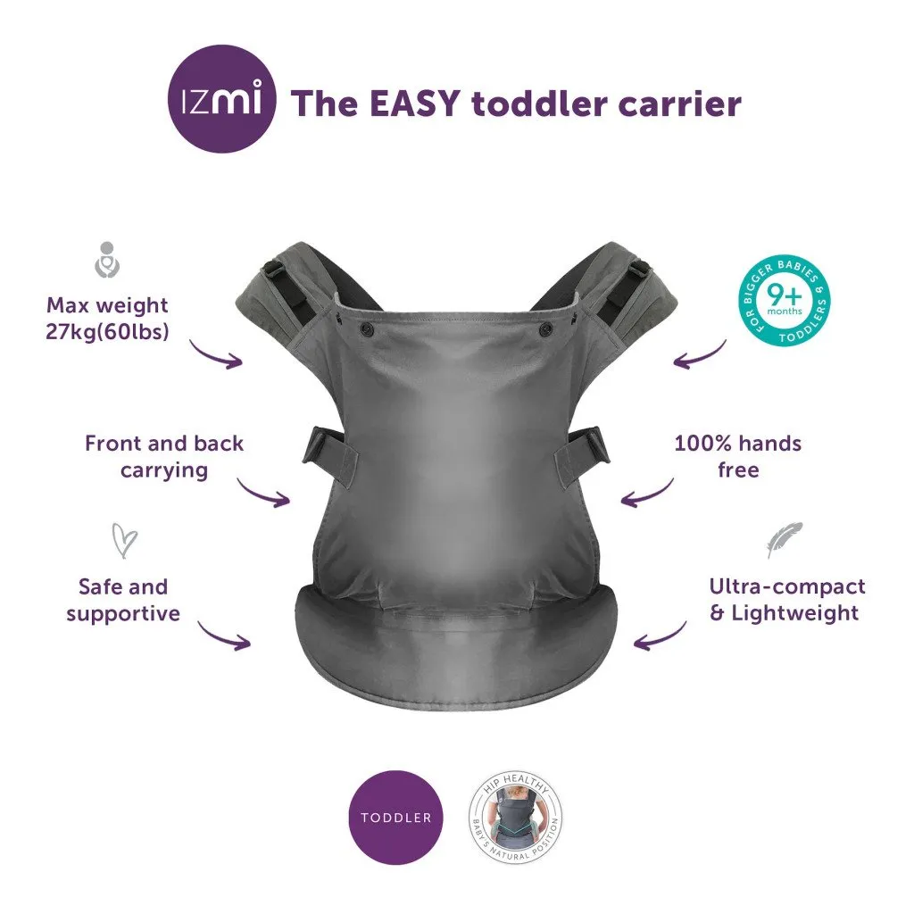 The Izmi Toddler Carrier is designed for bigger children needing extra panel height and support. It offers a structured yet lightweight feel, ideal for back carrying older toddlers.